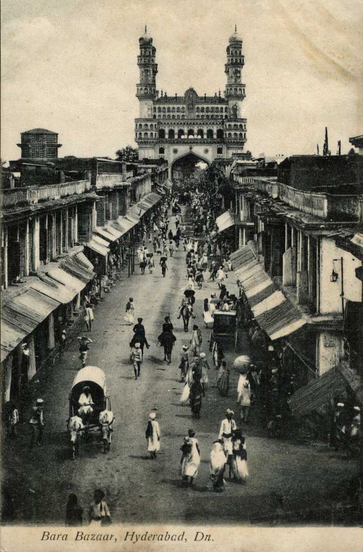 Vintage black and white undated postcard of Bara Bazaar, Deccan