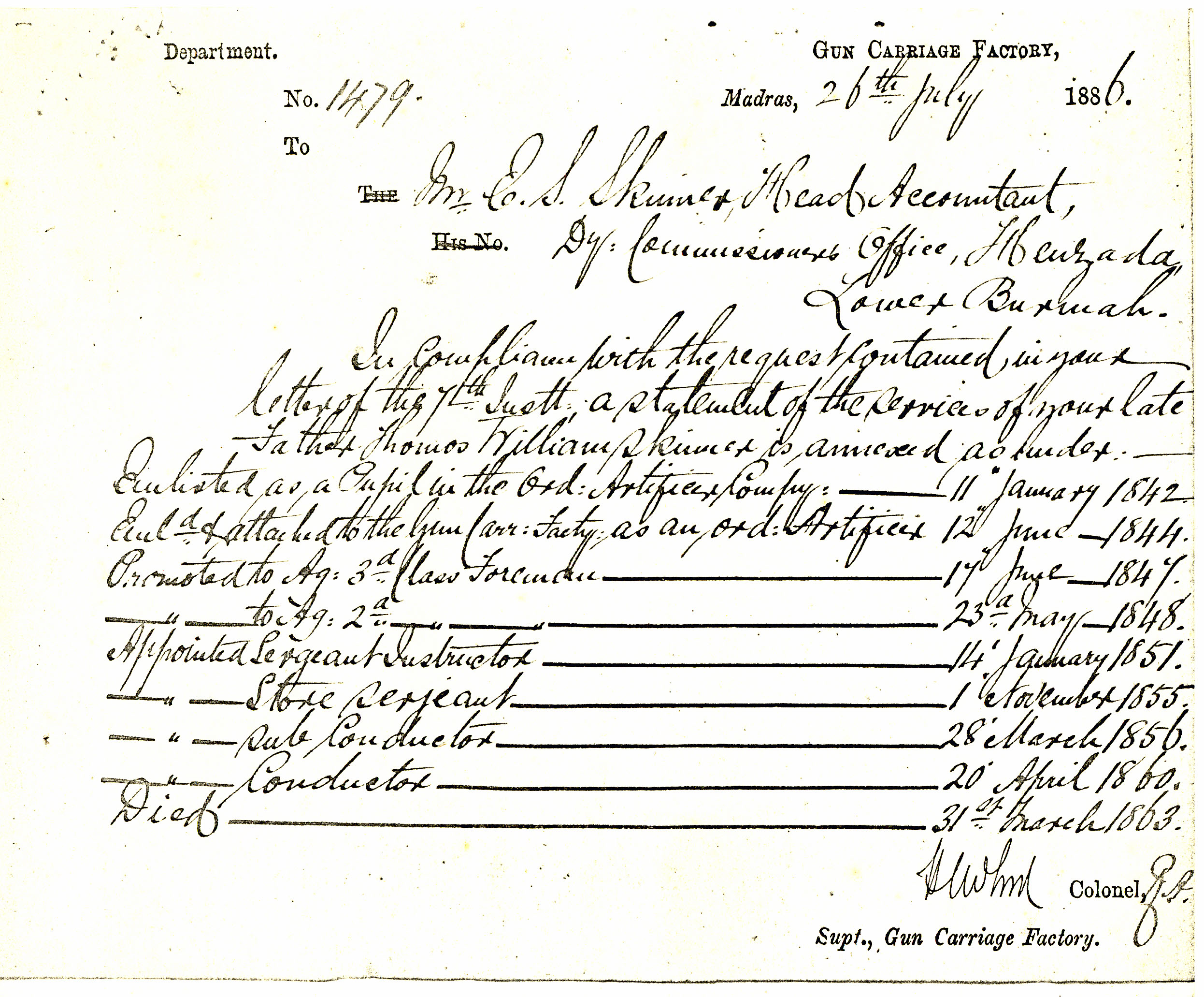 Service History of Thomas William Skinner Conductor of the Madras Gun Carriage Factory