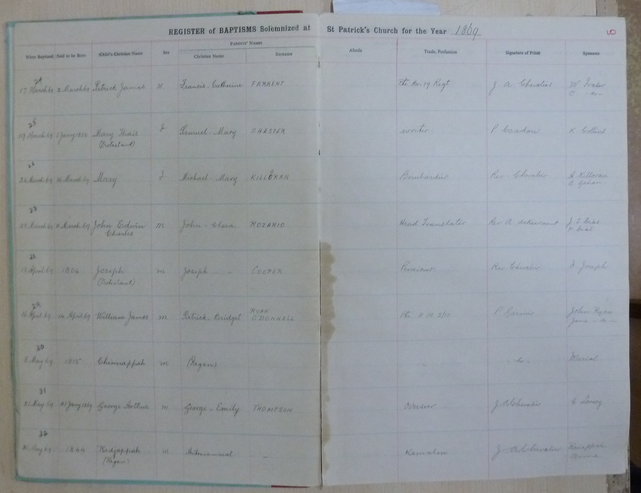 Image title: St Patricks Church, Bangalore Register of Baptisms 1868 to 1898 - page 10
