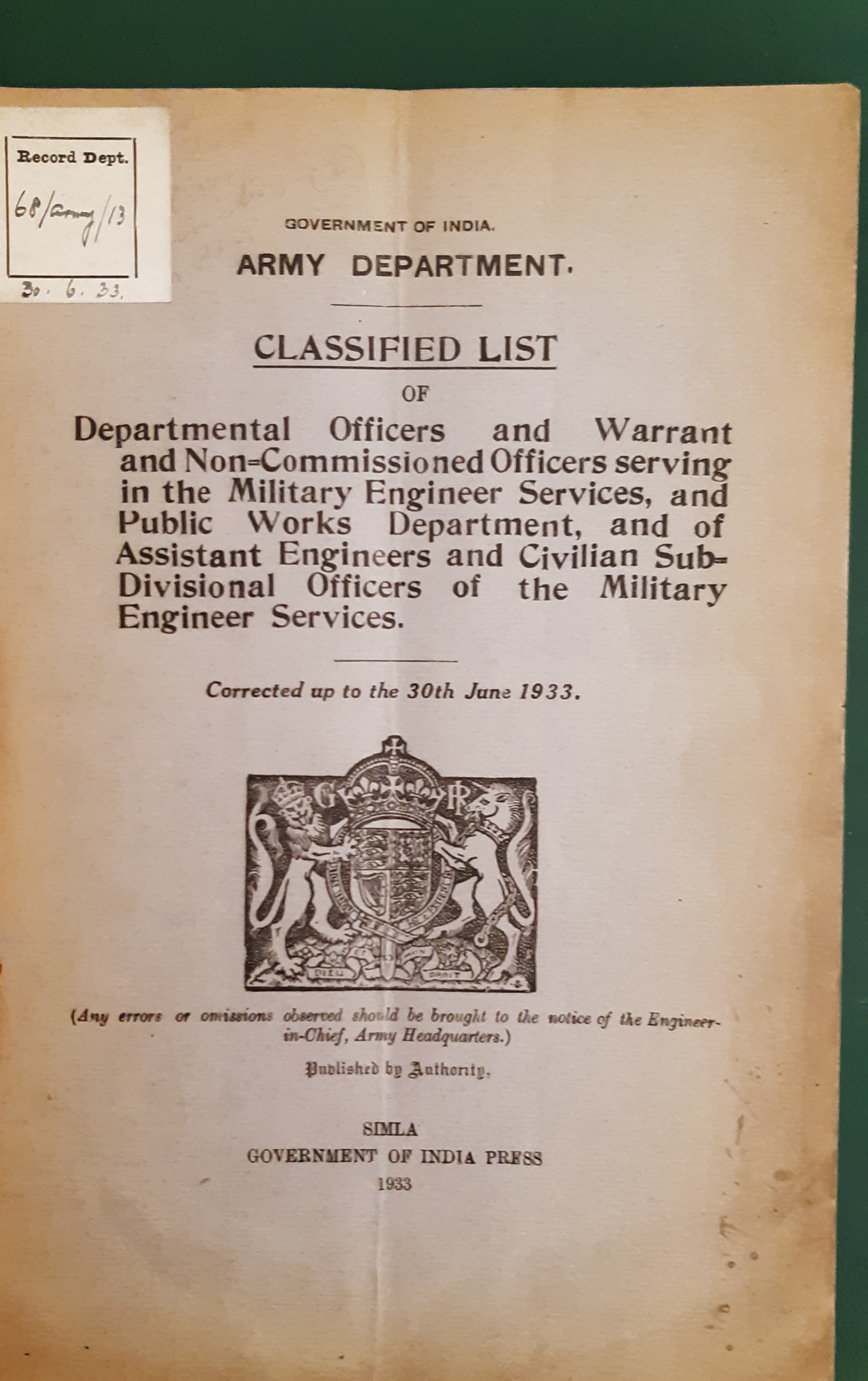 Image title: Govt of India Army Dept, Cover of Booklet for MES 1933 File size: 668,953 bytes