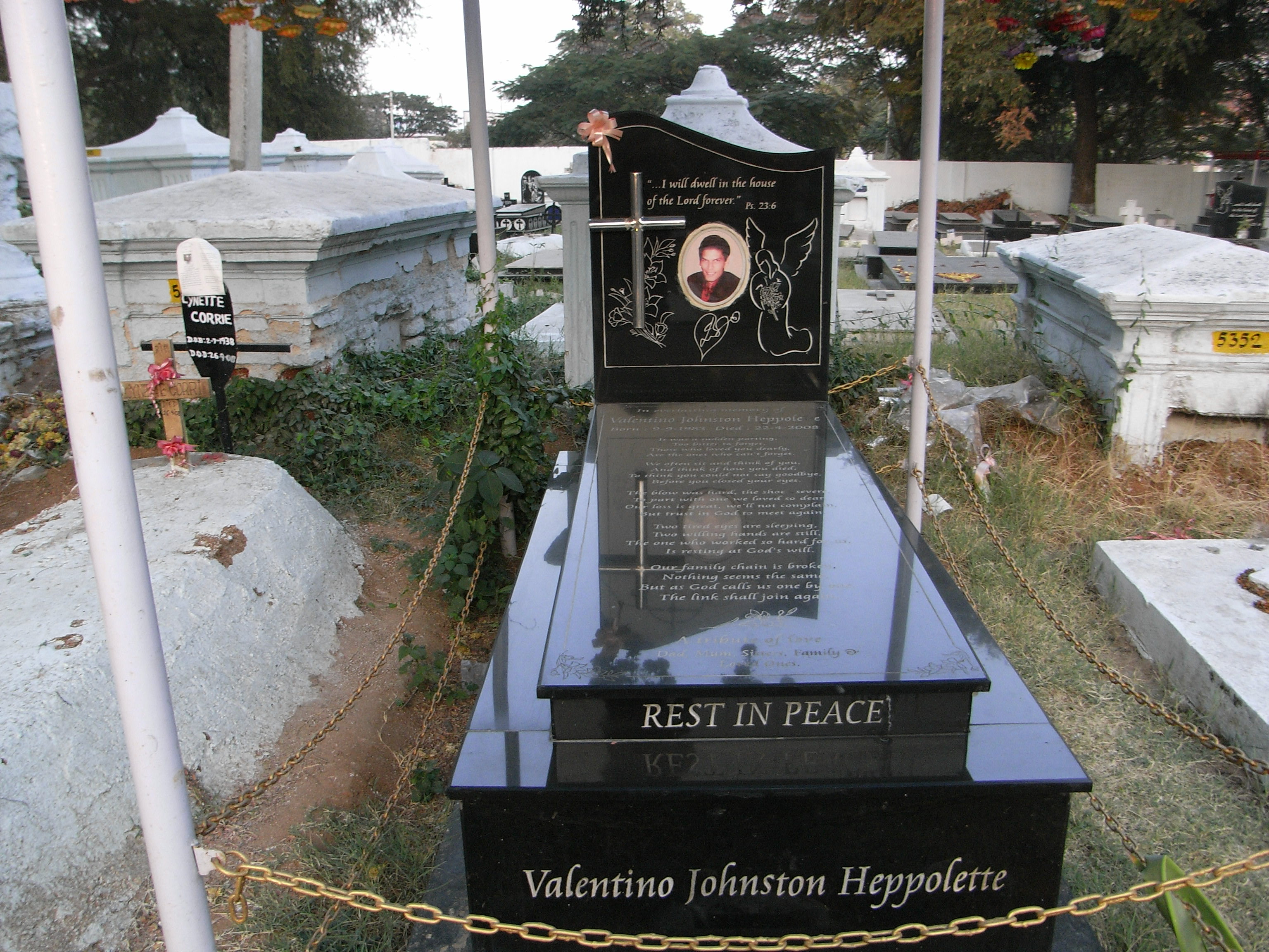 Inscription reads: Valentino Johnson Heppolette Born: 9.9.1983 Died: 27.4.2008