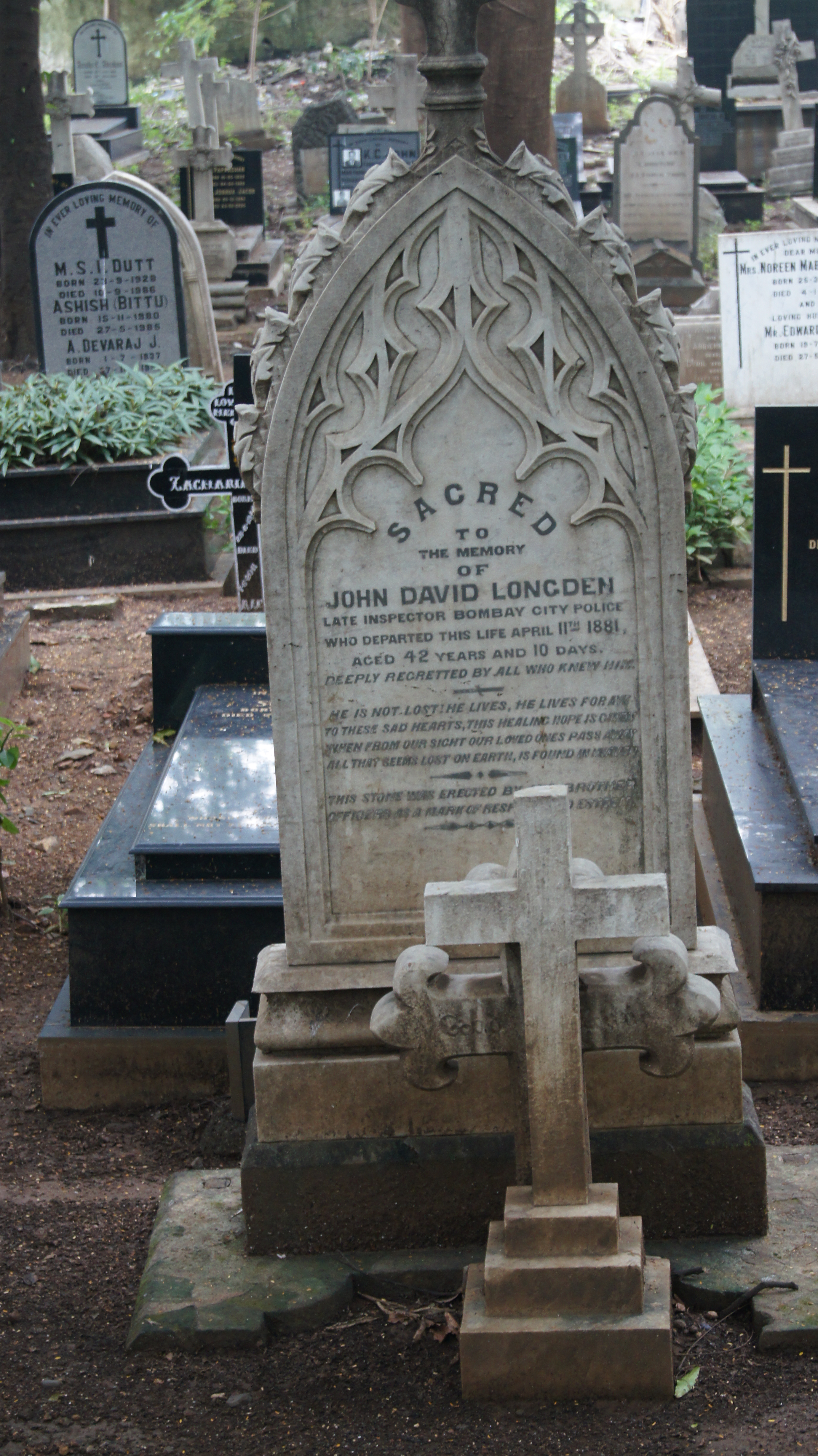 Sacred to the Memory of John David Longden, Late Inspector, Bombay City Police, who departed this life April 11th 1881, aged 42 years and 10 days. This stone was erected by his brother officers as a mark of respect and esteem.