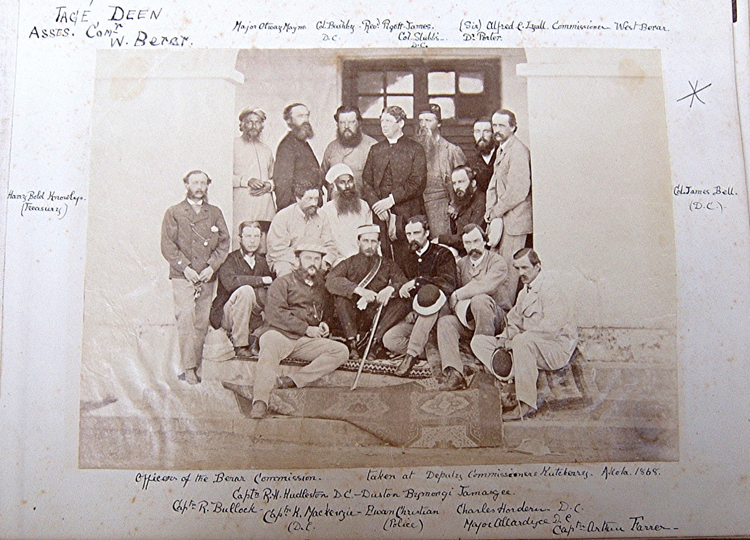 The Officers of the Berar Commission, c. 1868. Featured are: Tage Deen, Assistant Commissioner, West Berar; Major Otway Mayne;Col. Bushby, D.C.; Rev. Pigott-James; Col. Stubbs, D.C.;Sir Alfred C. Lyall, Commissioner, West Berar; Dr. Porter, Capt. R.H. Hudleston, D.C.; Capt. R. Bullock; Capt. K. Mackenzie, D.C.; Duston Bymongi Jamargee; Ewan Christian (Police); Charles Hordern, D.C.; Capt. Arthur Farrer; Harry Bold Knowlys (Treasury); Col. James Bell, D.C.