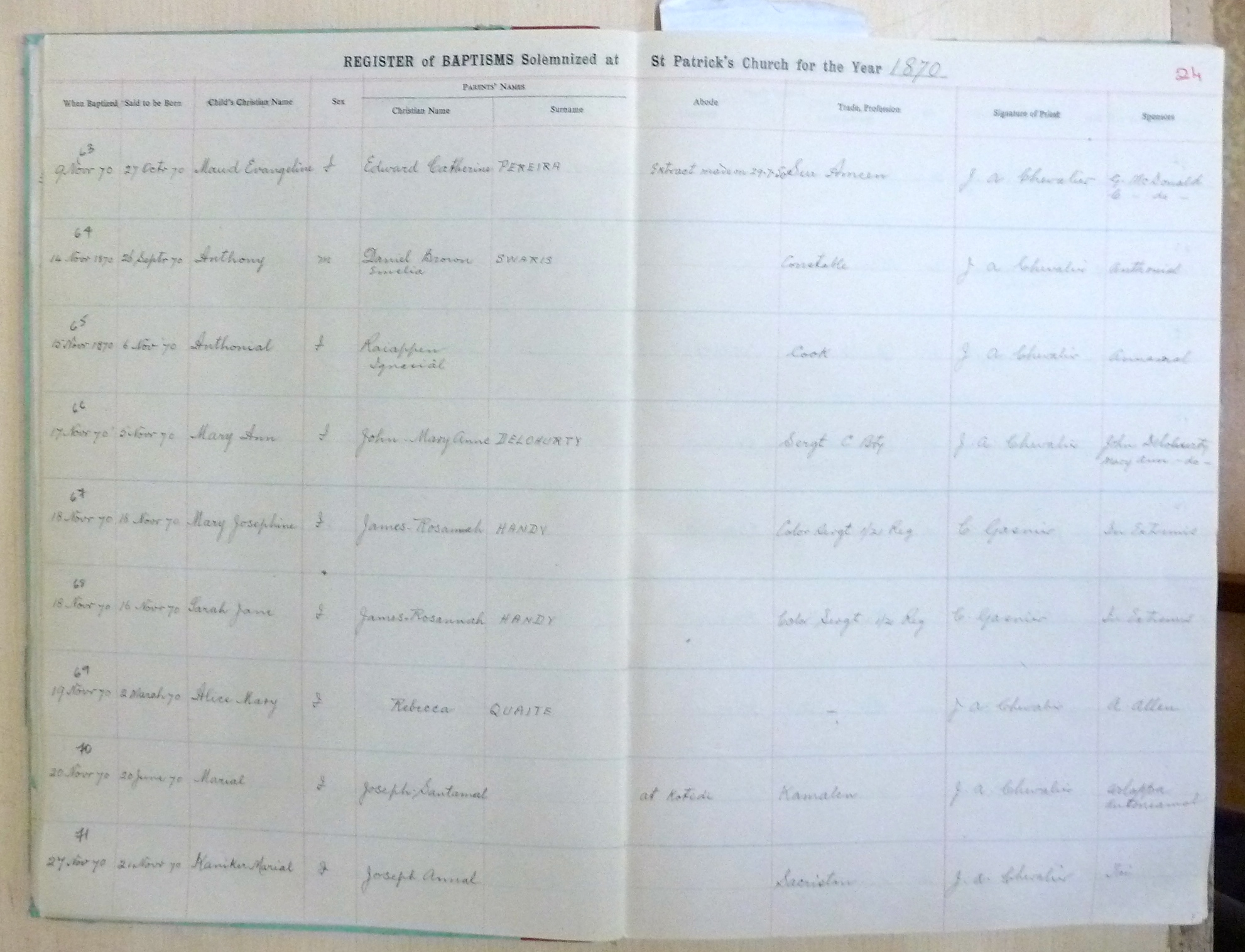 Image title: St Patricks Church, Bangalore Register of Baptisms 1868 to 1898 - page 24 File size: 879,181 bytes