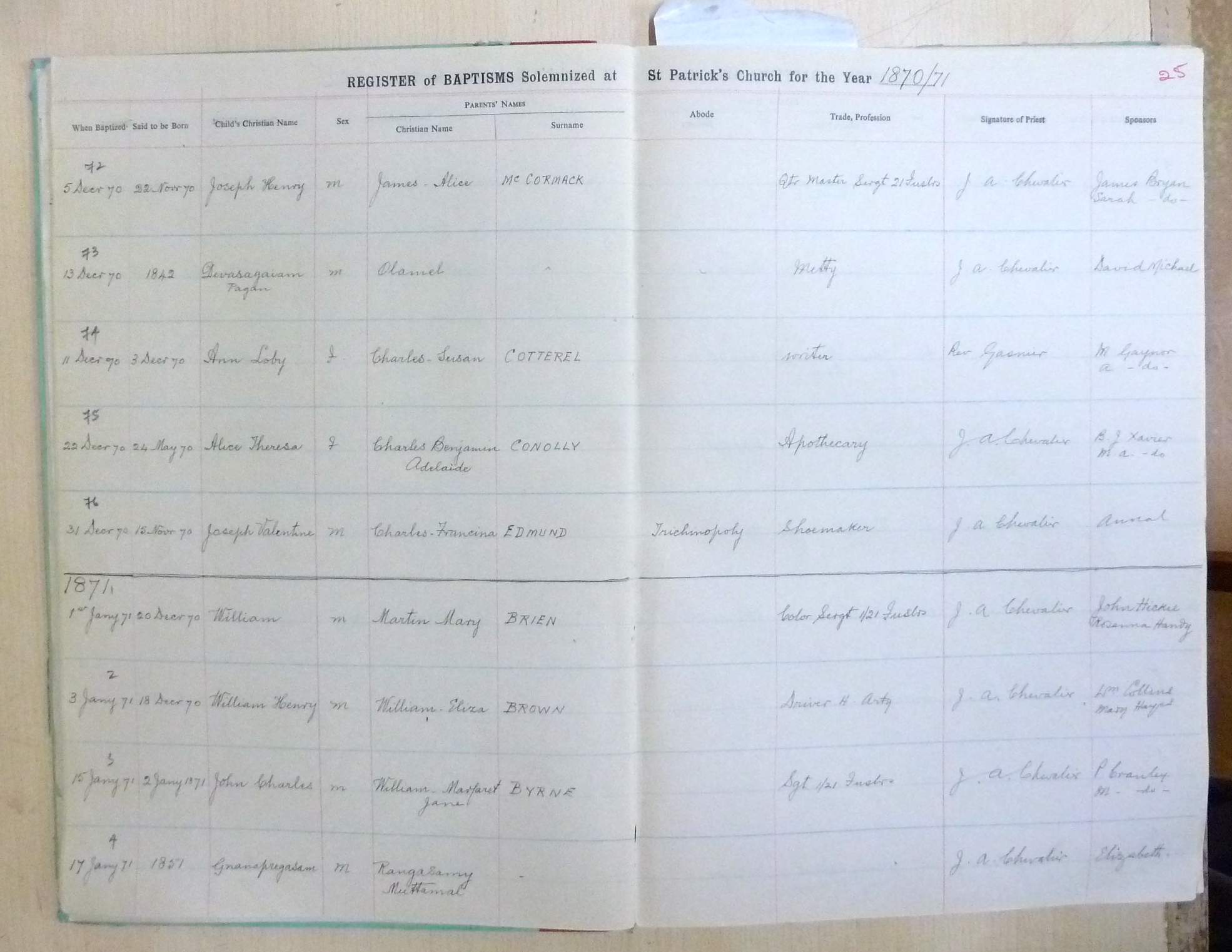 Image title: St Patricks Church, Bangalore Register of Baptisms 1868 to 1898 - page 25 File size: 923,030 bytes