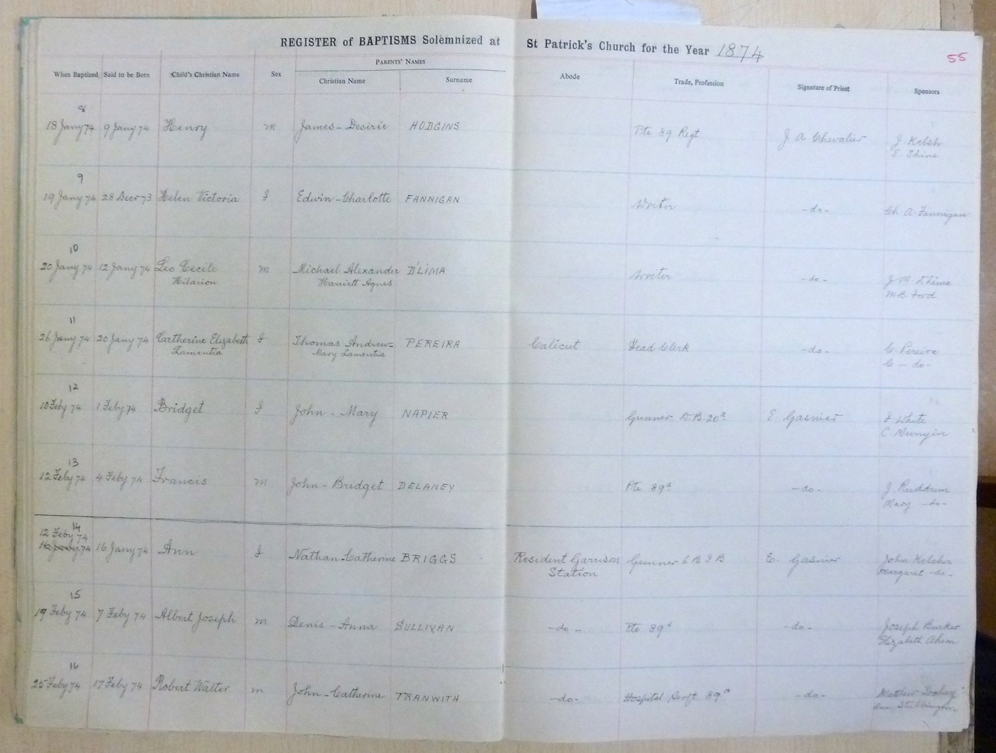 Image title: St Patricks Church, Bangalore Register of Baptisms 1868 to 1898 - page 55 File size: 838,265 bytes