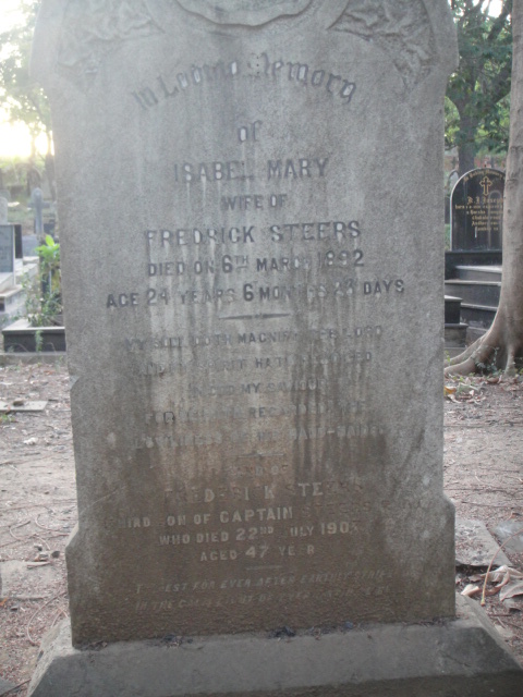 In Loving Memory of Isabel Mary, wife of Frederick Steers. Died 6th March 1892. Aged 24 years 6 months and 3 days. Also Frederick Steers, Third son of Captain Steers, R.N., who died 22nd July 1890, Aged 47 years.